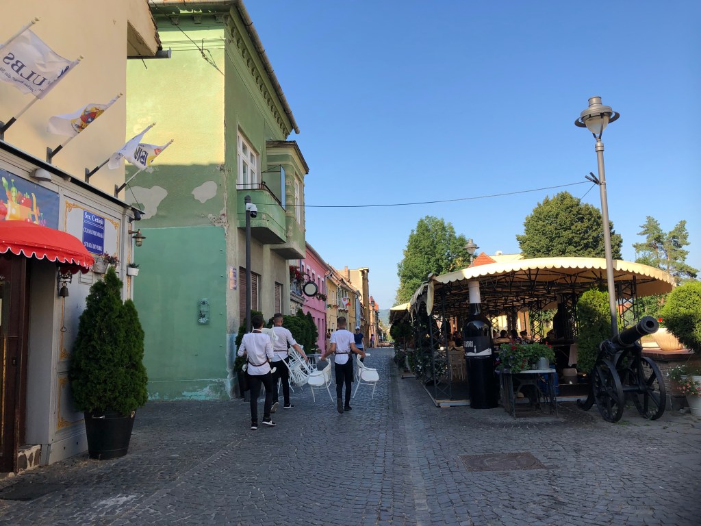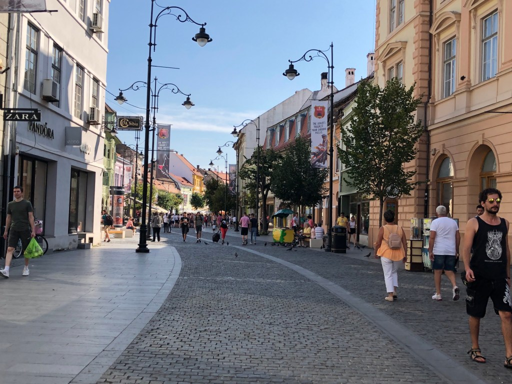 בחזרה לכיכר הגדולה. ברחבת בית העיריה מתקיים בערב פסטיבל מוזיקה והבמה כבר מוכנה. הכיכר מובילה אל מדרחוב Nicolae Bălcescu. מדרחוב פעיל וססגוני בו ניתן למצוא מגוון חנויות רשת פופולריות לשמחתה של הקניינית שלנו. אם תגיעו לקצהו ותפנו שמאלה תתחברו לטיילת ולחפיר המקיפים את העיר. כאן ניתן להתרשם מהמגדלים הגבוהים שהיו חלק מביצורי החומה.