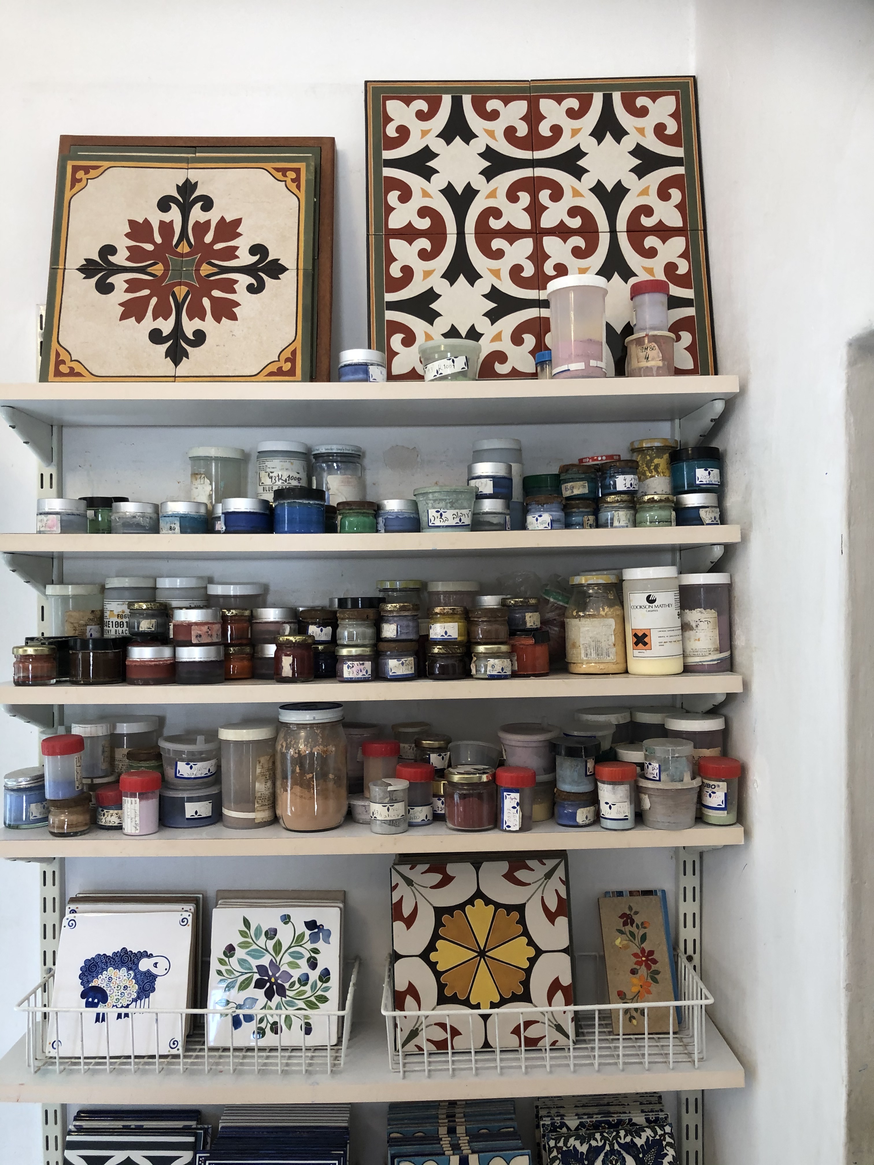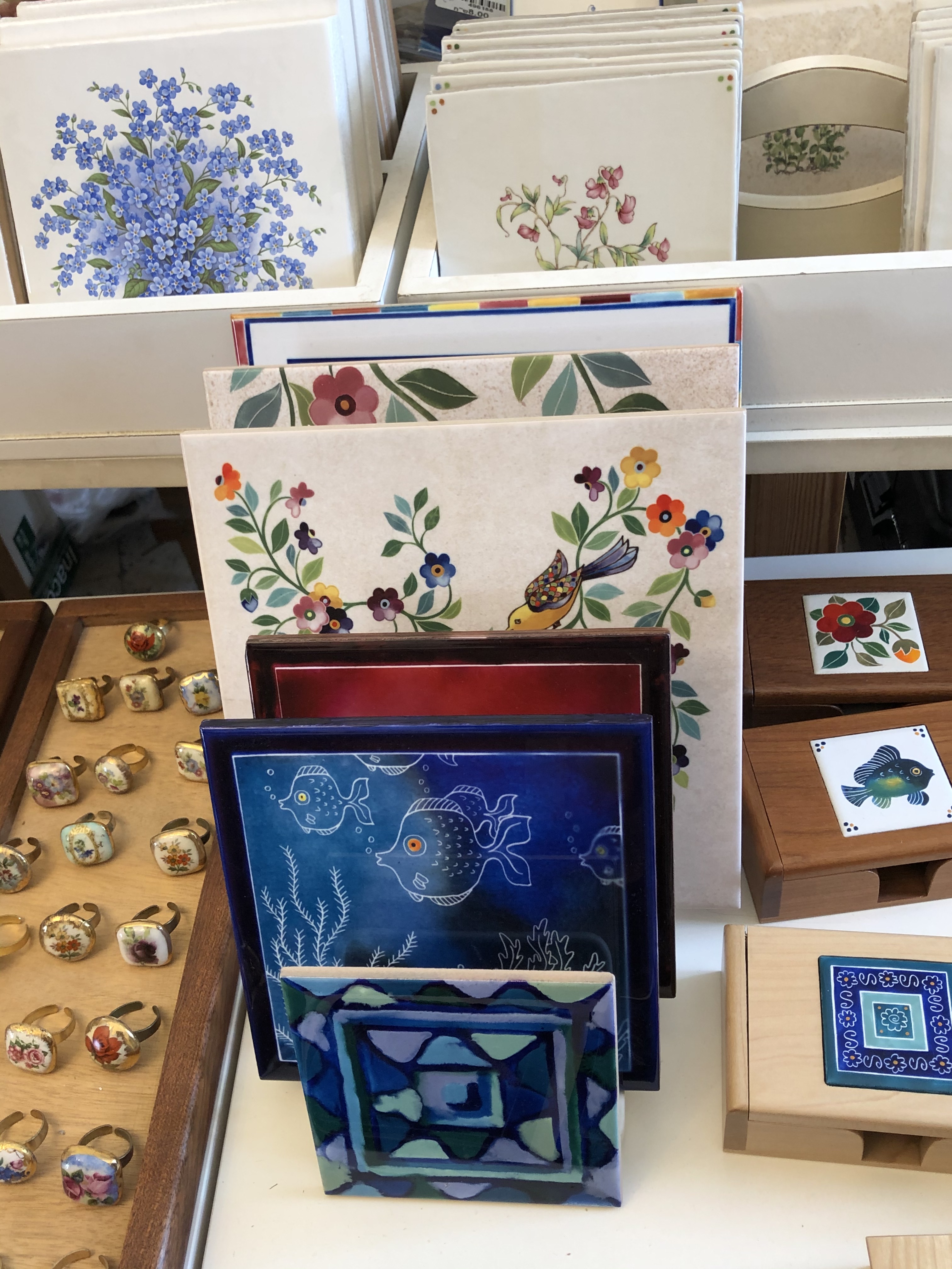 אחר כך עולים אל הסטודיו שלה שנמצא במפלס הגג. בסטודיו תמצאו אריחים מצויירים, חפצי נוי מאויירים, תכשיטים ומתנות שימושיות מעשה ידיה ושל אמנים יוצרים נוספים מעין כרם. ליד הסטודיו טרסה גדולה ונוף נפלא לכנסיית יוחנן בהרים. ומי השכן? שף מהולל ששיפץ בית ערבי יפיפה במיקום אסטרטגי. את שמו לא אחשוף. בגלריה הבאה תראו את הדלת. תבואו ותשמעו. 😉