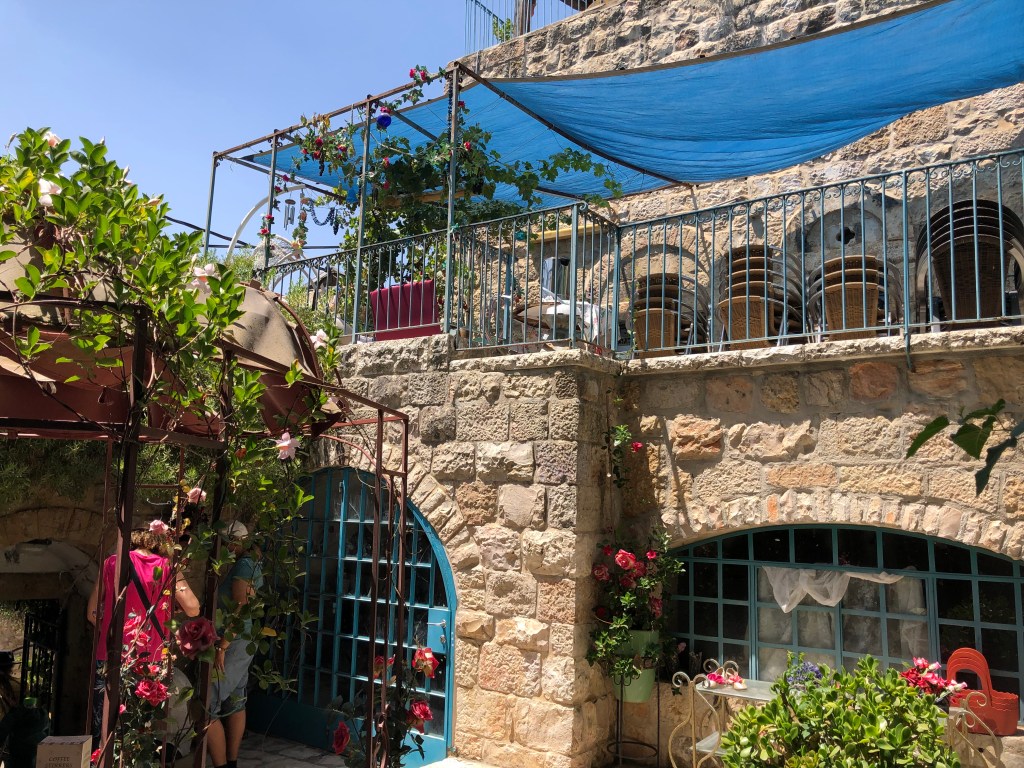 ממשיכים לטייל לאורך רחוב המעיין. כמה מהבתים היפים והעתיקים מאכלסים היום מסעדות. לרובם יש גם טרסה לנוף והמראה יפה מאד. לאחת מהן עוד נחזור בסוף הסיור אבל אני מקדימה את המאוחר. במעלה רחוב המעיין בבית מספר 1, נמצא ביתו של דר' יואכים. הדלת הכחולה מושכת את העין. עוד נראה דלתות כחולות בסיור וכולן נראות צופנות סוד.