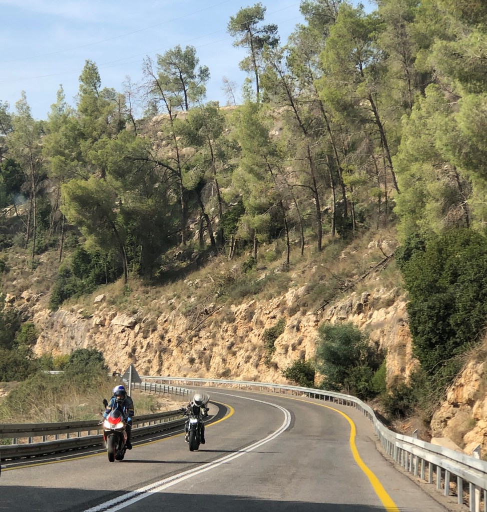לא פשוט למצוא ארוחה באזור בימי קורונה. קראתי המלצות על בר בהר במושב נס הרים והחלטנו לנסות שם. כדי להגיע לנס הרים נוסעים באחד הכבישים היפים יותר בארץ. כביש 386 ואחריו 3866. הדרך מעלפת. מדי פעם חותכים אותנו אופנוענים במנוע מרעים. הם אוהבים לקחת את הפיתול במהירות רבה. אני מנסה לצלם אותם ללא הצלחה רבה. הם מהירים מאד.