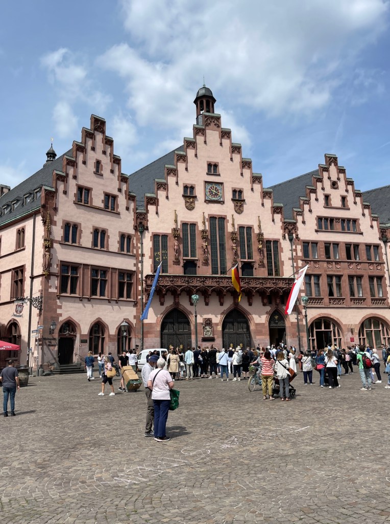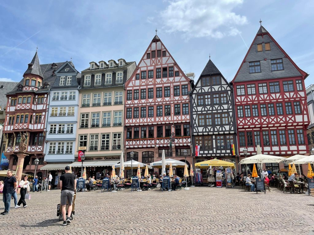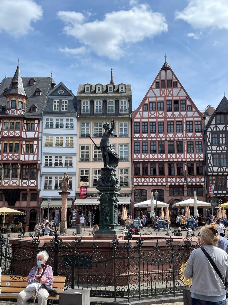 חלק מהעיר העתיקה שוחזר בצורה מעוררת פליאה – זהו המרכז ההיסטורי שנקרא Römerberg. קרל הגדול בנה במקום את המצודה שלו כדי להגן על מקום החצייה של הנהר. מעט מאד מבנים נותרו מהעיר המקורית. הבתים ששוחזרו סביב כיכר Romer, כיכר בית העירייה, צבעוניים ויפים והכיכר שוקקת חיים. במרכזה מזרקה של אלת הצדק, מחזיקה את מאזני הצדק בידה. בבניין העירייה נערכות חתונות ויצא שראינו כמה זוגות נרגשים ביום חתונתם. ליד הכיכר תמצאו את המסעדה Haus Wertheym, שנחשבת המסעדה הוותיקה בפרנקפורט. היא פועלת משנת 1479 וממוקמת בבית ציורי. לא ניסינו אותה.