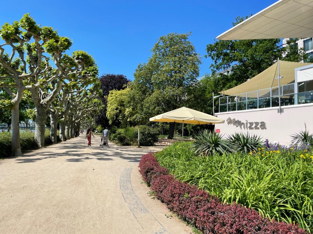 הליכה לאורך הנהר מאד נעימה. הוקמה טיילת ארוכה ומטופחת ופארק עירוני ירוק שנקרא NIZZA PARK. לאורך הטיילת ספסלים ומתקני ספורט. מעל הנהר מספר גשרים. הבולט והידוע ביניהם הוא גשר הברזל הישן Eiserner Steg. הגשר הזה הוא אחד הסמלים של העיר ונקודה אהובה על צלמים ומצטלמים. הגשר עמוס במנעולי אהבה צבעוניים. הגשר מחבר בין נקודת הכניסה לכיכר הרומר ואזור זקסנהאוזן, רובע המוזיאוניים והבילויים שגדה הדרומית. הגשר נבנה במקור בשנת 1868. הוא הופצץ במלחמת העולם השניה ועם סיומה נבנה מחדש.