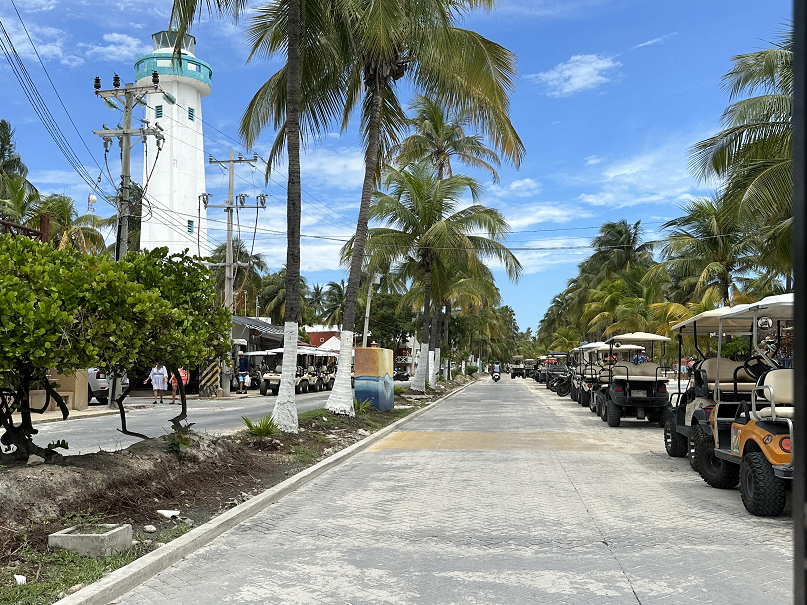 זהו אי קטן שניתן להקיפו בשעה נסיעה. כלי התחבורה הנפוץ באי הן מכוניות הגולף שניתן להשכיר ברחוב הראשי, ממש ביציאה ממעגן המעבורת. את המכוניות ניתן להשכיר לשעה, שלוש שעות או יום שלם. חצינו את הרחוב, נכנסנו לאחת החנויות ושכרנו מכונית גולף ליום שלם ב 1100 פזוס.