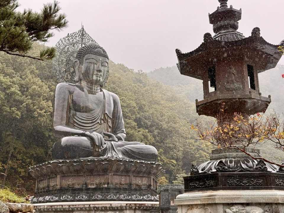 10/10 – פארק סרואקסן Seoraksan. היום המפוספס של הטיול. את כל הדרך הארוכה מג'ואנגו עשינו כדי לבקר בפארק שנחשב שמורת טבע מרהיבה, היפה בקוריאה. יש כאן הר גבוה אליו עולים ברכבל, עם נוף מרהיב ושפע מסלולי טיול ומפלים. כל זאת כמובן בתנאי שרואים משהו. נפלנו על יום גשום ביותר עם ערפל וראות אפס. ניסינו לעלות ברכבל (מכרו כרטיסים) אך גם למעלה לא ראו כלום. בצר לנו הסתפקנו בצילום עם הבודהה הגדול והמרשים, טיילנו קצת תחת מטריה והמשכנו הלאה לסאול. ביום יפה אמור להיות פארק מקסים. הבעיה שהוא רחוק מאד מסאול ומבוסאן וקשה לתזמן ביקור לפי תנאי מזג האוויר. אז זה הפספוס שלנו וכנראה שנצטרך לחזור.