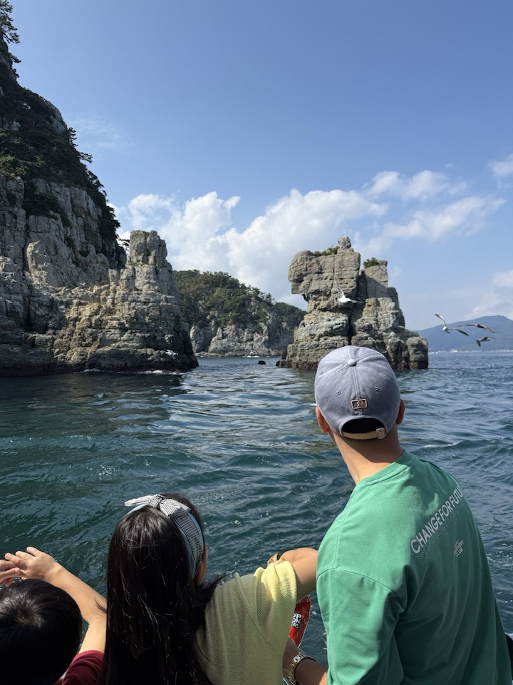 היום כלל שייט במעבורת אל שמורה בה סלעים מרשימים שעולים מהים- Geoje Island Haegeumgang
